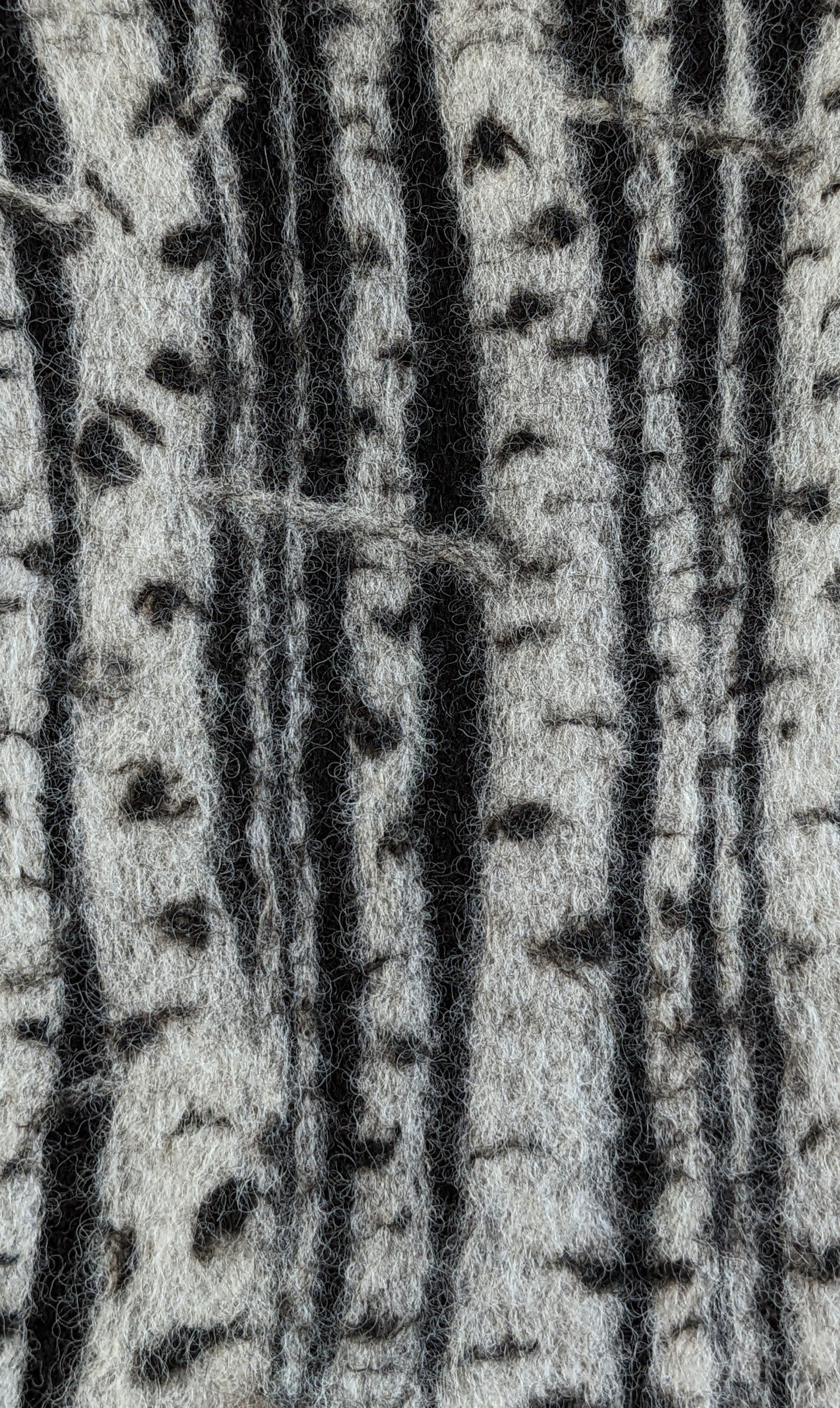 I call my process "Painting with Fiber" and use the fiber from the alpacas that I raise on my ranch in Colorado. I am always inspired by the natural world around me. My process begins by partially felting a "Canvas", then adding my design by needle or wet felting, and finishing with a cohesive piece of fabric. I use natural alpaca colors in addition to hand dyeing the brilliant colors.